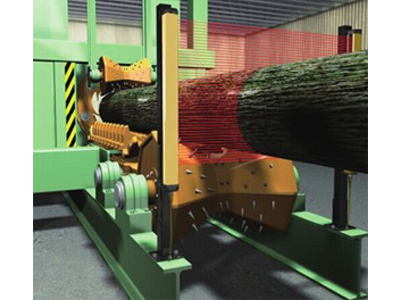 進入剝皮設備前測量原木外徑。當木向剝皮機前進時,接收器算出總 的被遮擋的光束數,然后轉換成模擬信號傳輸給剝皮工位的控制系統, 控制系統接收到模擬信號后,根據原木的大小調整夾具和剝皮刀具,準 確的測量原木尺寸能很好地保證生產的穩(wěn)定和剝皮設備不受損壞。