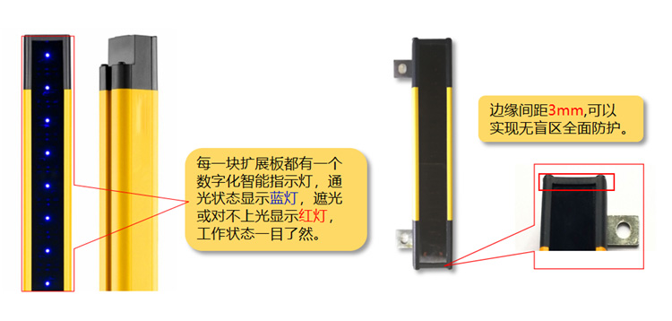 基于微機(jī)控制的一套高品質(zhì),高性能安全防護(hù)產(chǎn)品,每一塊擴(kuò)展板都有一個(gè)數(shù)字化智能指示燈,工作狀態(tài)一目了然,無盲區(qū)型,邊緣距離為3mm,安全系數(shù)更高功能強(qiáng)大,自檢功能完善,使用簡單,安全可靠,響應(yīng)時(shí)間15ms以內(nèi),對射距離可達(dá)10米,適合多種環(huán)境使用。