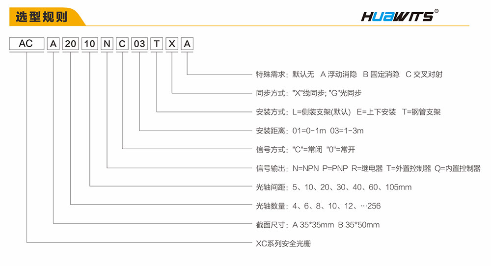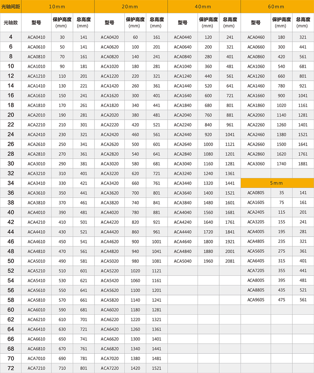 注明:此型號(hào)產(chǎn)品光軸間距包括5mm、10mm、20mm、30mm、40mm、60mm、105mm多種,選型表中未完全體現(xiàn),如您的選擇未在其中,請(qǐng)聯(lián)系我們?yōu)槟x型。