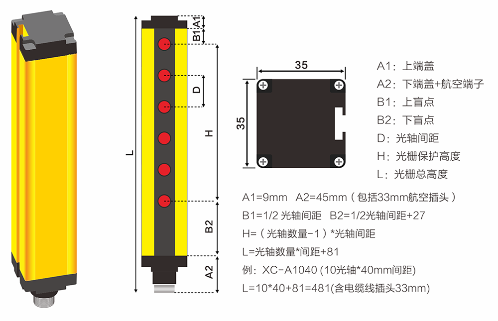 本系列所有產(chǎn)品總高度=(光軸間距*光軸數(shù)量)+81mm。